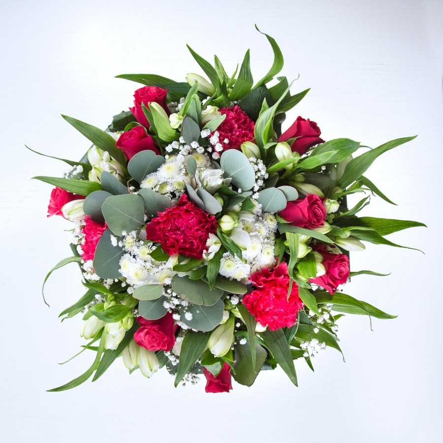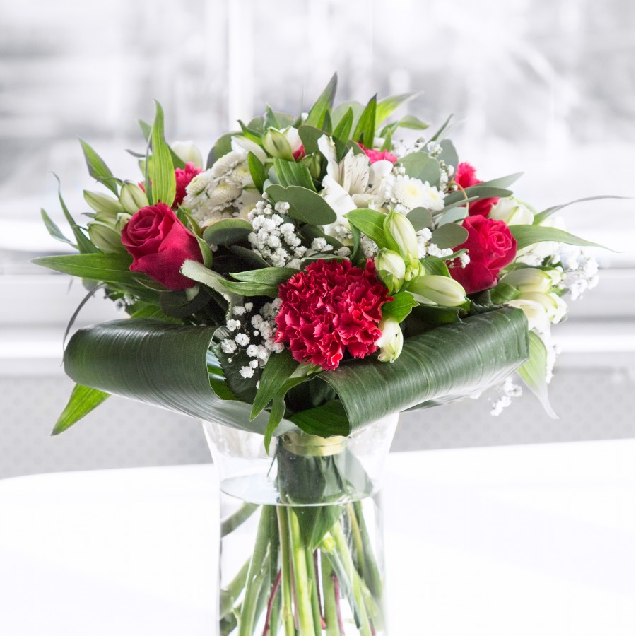 Unleash pure creativity with the IMAGINATION bouquet from Flowers Isle of Dogs. This luxurious hand-tied arrangement blends romantic red roses and carnations with sweet mini white chrysanthemums, airy gypsophila and elegant white alstroemeria, all framed by glossy aspidistra leaves for a premium finish. Expertly arranged by our Isle of Dogs florists, IMAGINATION is perfect for birthdays, anniversaries, congratulations or simply to brighten someone's day with a stunning surprise. Each stem is carefully selected for freshness and quality, with flowers delivered in bud so you can enjoy watching them bloom and last longer in your home. With a 5-day freshness guarantee, you can send this bouquet with complete confidence. All available sizes are shown, and the vase pictured is for illustration purposes only, allowing you to pair it with your own favourite vase or one from our collection. Order online from Flowers Isle of Dogs for fast next day flower delivery when you buy before 4 pm. Whether you're sending love across London or treating yourself to a luxury bouquet, IMAGINATION is a striking choice that adds colour, elegance and a touch of wonder to any space.