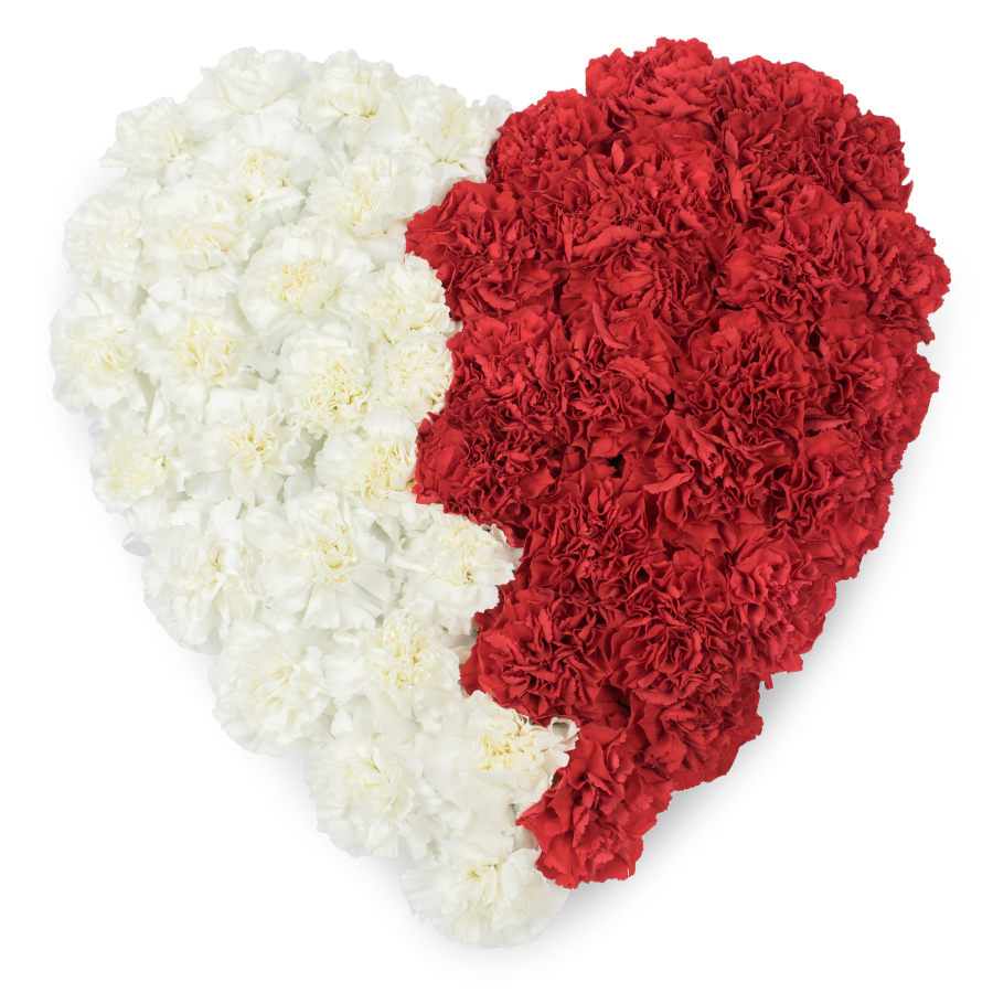 Embrace serenity with our Serene Carnation Heart Bouquet from Handy Flowers. This exquisite arrangement features a harmonious mix of white and red carnations, meticulously arranged in a heart shape to convey your heartfelt emotions.
